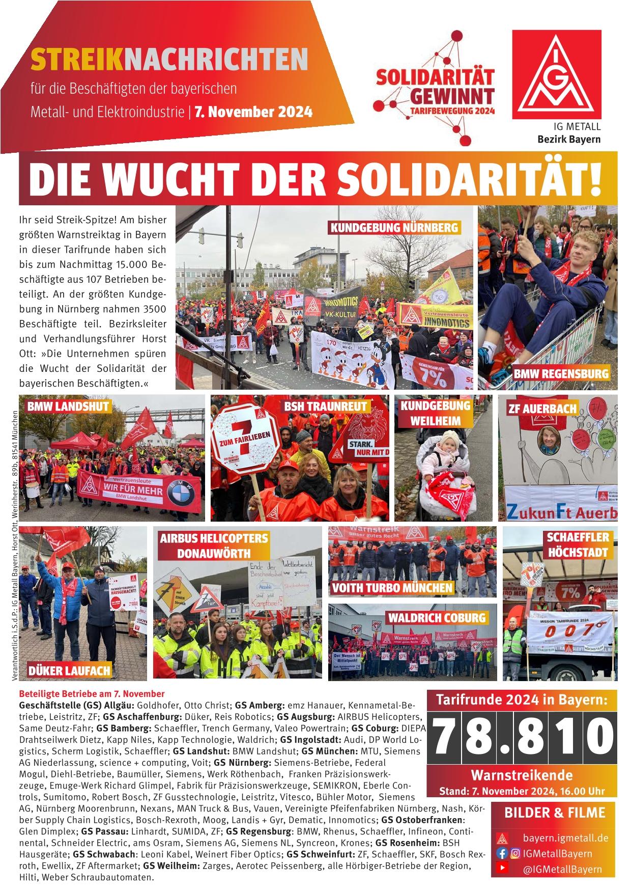 Beschäftigte in 107 bayerischen Betrieben legen Arbeit nieder, 3500 Warnstreikende ziehen durch Nürnberg, Bänder in BMW-Werken Regensburg und Landshut standen still, Audianer greifen in der Nacht ins Geschehen ein. Ott: „Die Unternehmen spüren die Wucht der Solidarität der bayerischen Beschäft