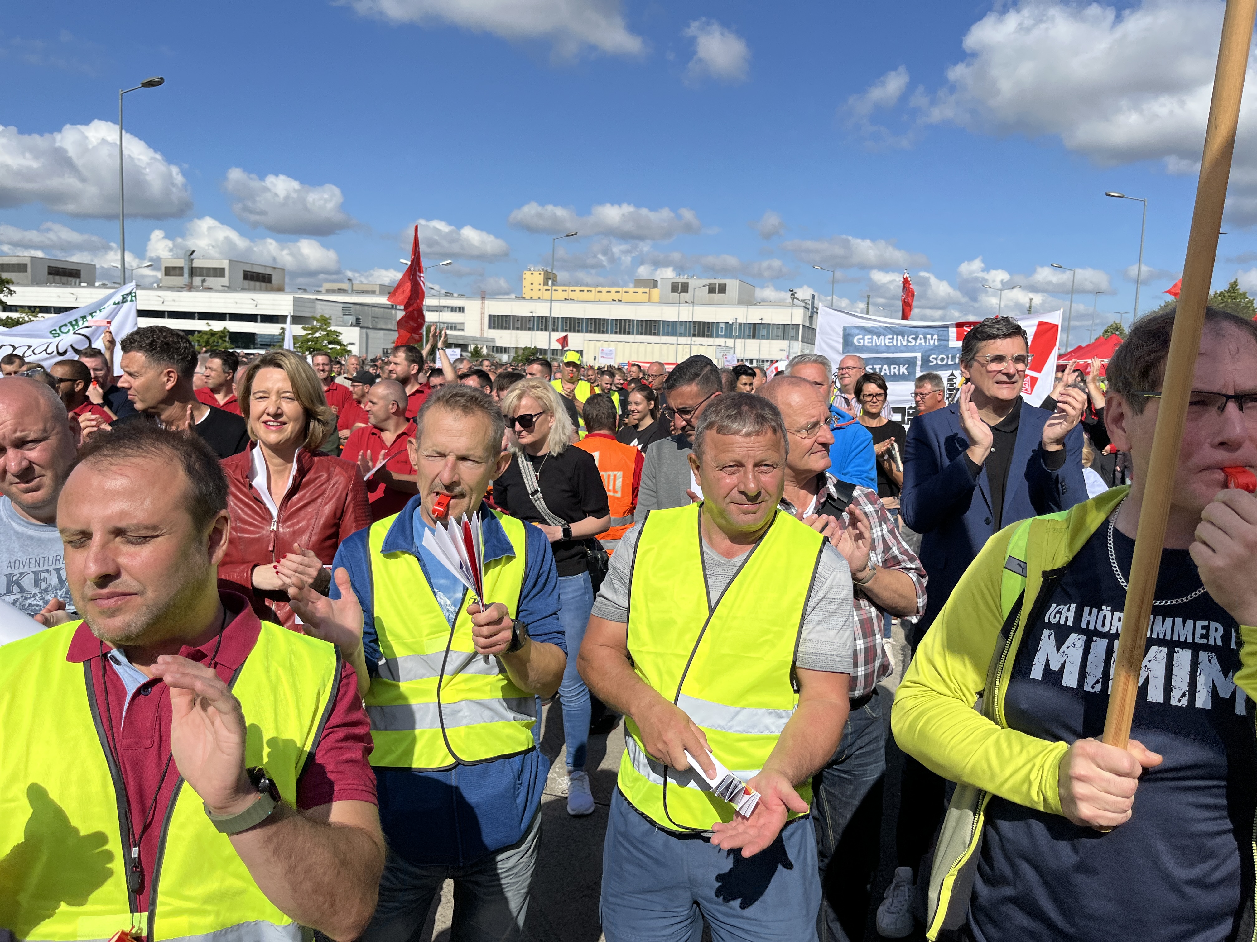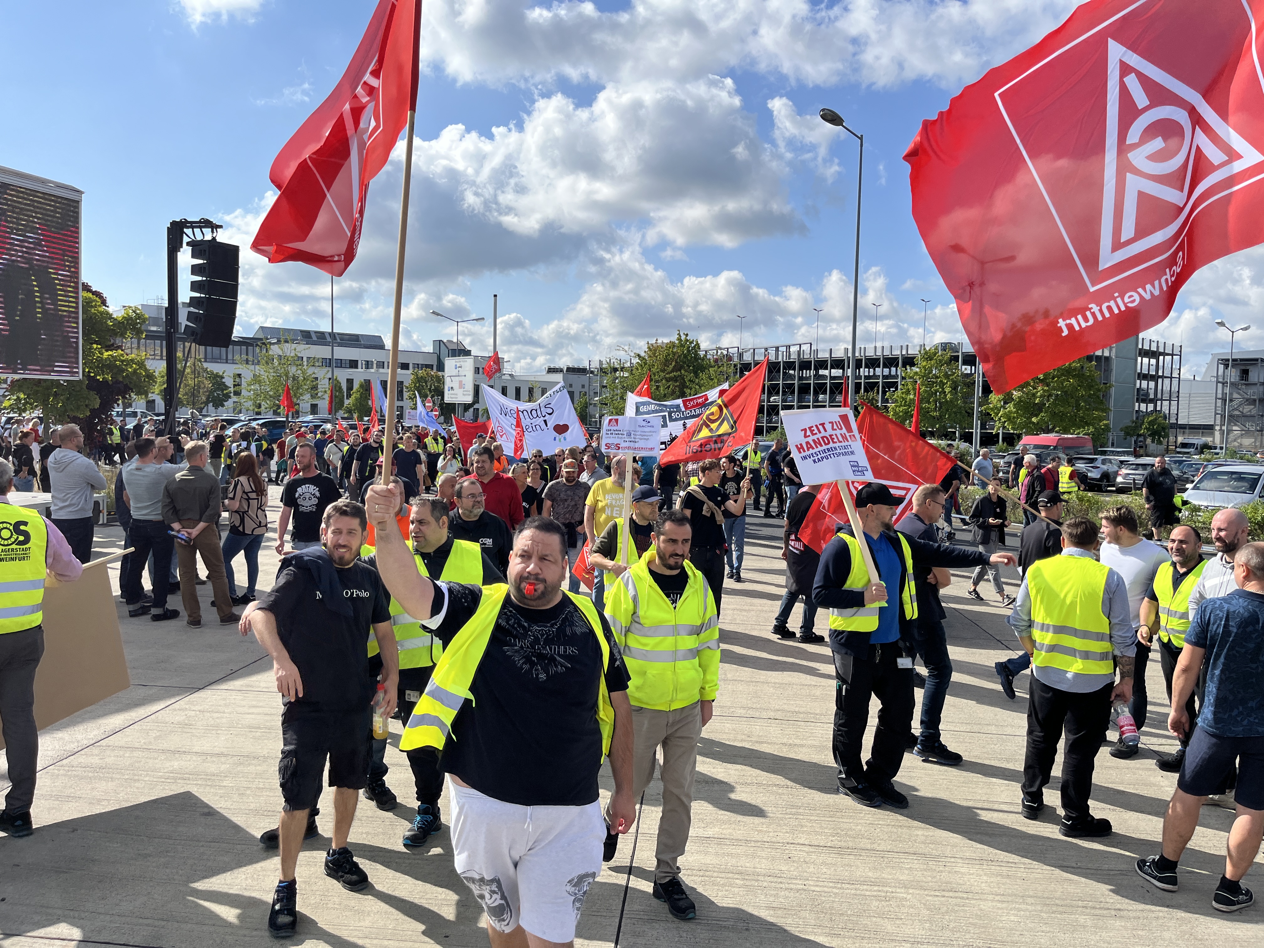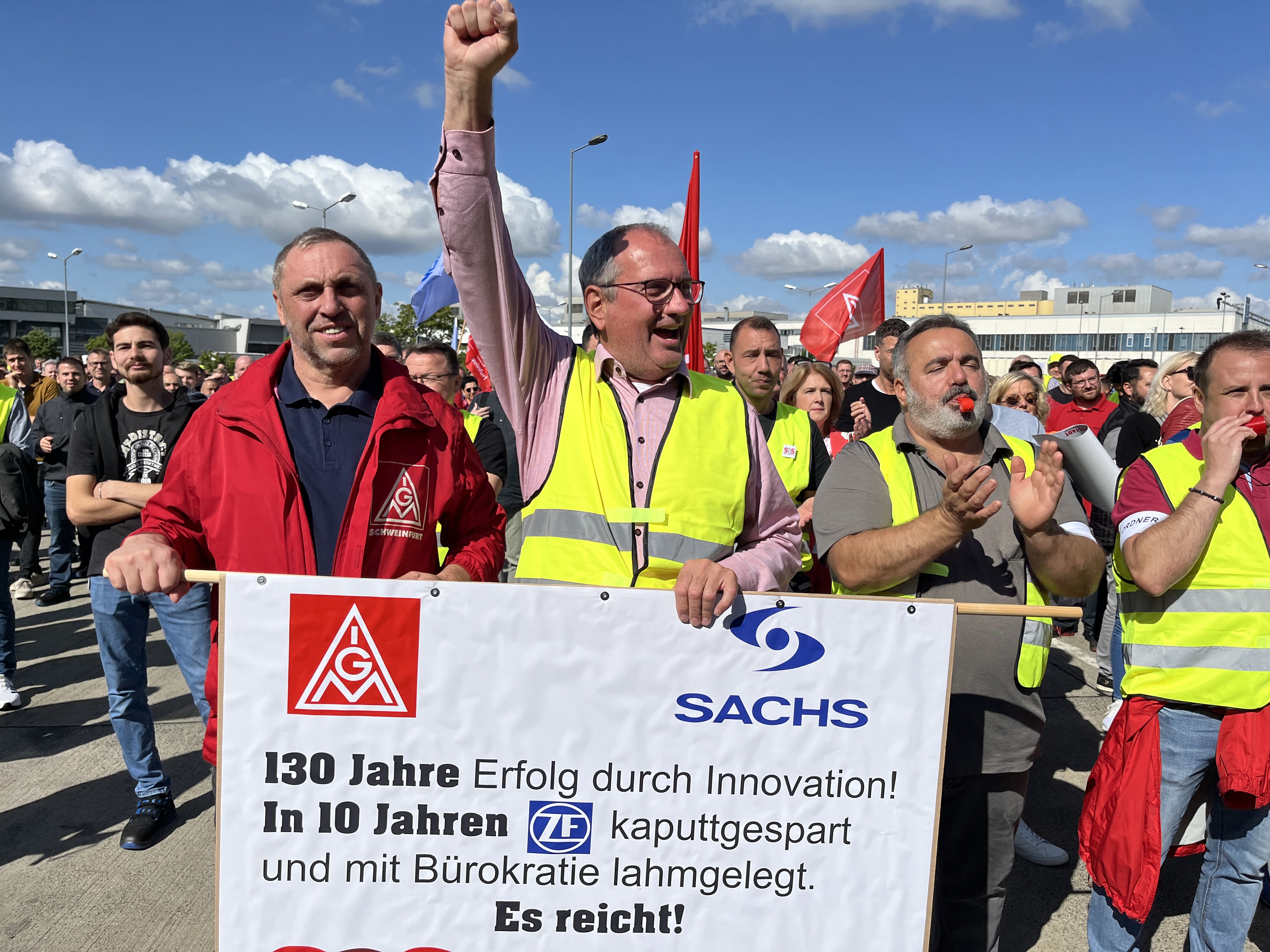 Was für ein starkes Zeichen des Widerstands: 6500 ZF-Beschäftigte in Schweinfurt, Auerbach, Thyrnau, Nürnberg und Bayreuth haben beim bundesweiten ZF-Aktionstag am 29. Juli 2025 für ihre Zukunft demonstriert. Das Unternehmen droht der Division E mit Verlagerungen, Stellenabbau und Ausgliederung. Und der Protest zeigte Wirkung: Der Aufsichtsrat hat in seiner Sitzung anders als geplant keine Entscheidung gegen die Zukunft der Division E getroffen. Doch die Kahlschlag-Pläne sind keineswegs vom Tisch. Wir haben nun Zeit gewonnen, bis Ende September einen gemeinsamen Weg mit dem Unternehmen für die Zukunft der Division E zu finden.