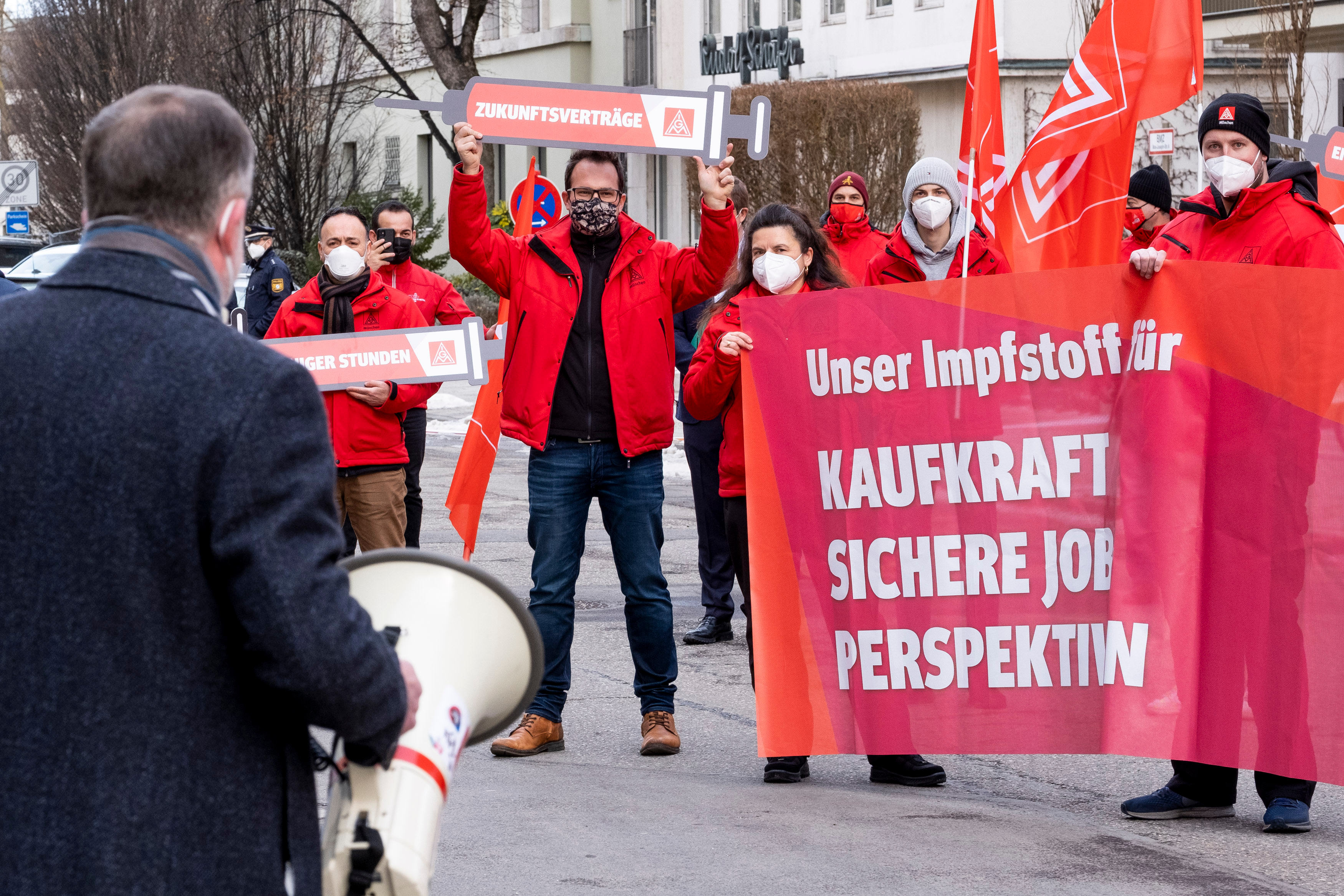 Die IG Metall Bayern hat heute in der zweiten Tarifverhandlung für die Beschäftigten der bayerischen Metall- und Elektroindustrie ihre Forderungen untermauert und mit einer Impfspritzen-Aktion vor dem Verhandlungslokal in München ein Signal an die Arbeitgeber gesendet. IG Metall-Bezirksleiter und Verhandlungsführer Johann Horn sagte: „Wir haben den Impfstoff für Kaufkraft, sichere Jobs und Perspektiven für die Beschäftigten. Unsere Impfstoffe sind 4 Prozent Volumen, Beschäftigungssicherung mit Teillohnausgleich, Zukunftstarifverträge und die unbefristete Übernahme von Azubis.“ 30 Betriebsräte aus Münchner Betrieben haben dem Arbeitgeberverband vbm bei einer Corona-konformen Aktion die IG Metall-Impfstoffe symbolisch in überdimensionalen Spritzen mitgebracht.