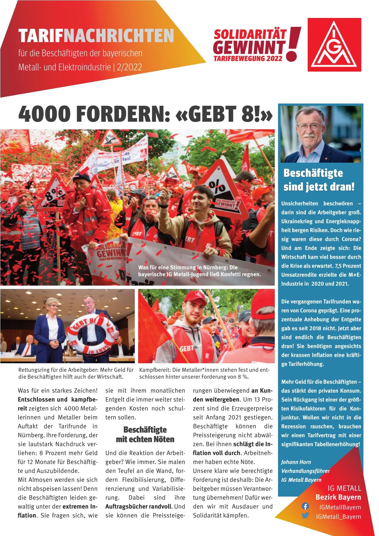 IG Metall-Bezirksleiter und Verhandlungsführer Johann Horn betont, wie dringend die Beschäftigten eine kräftige prozentuale Entgeltsteigerung brauchen: „Nach zwei Corona-Tarifrunden ohne Tabellenerhöhung und angesichts des extremen Anstiegs der Lebenshaltungskosten sorgen sich die Menschen, wie sie ihren Lebensunterhalt bezahlen sollen. Es gibt echte Existenzängste unter den Beschäftigten, die Stimmung in den Belegschaften ist aufgeheizt. Denn im Gegensatz zu den meisten Betrieben können die Menschen die Preissteigerungen nicht weitergeben.“ Das beweisen auch die in den letzten Monaten um über zehn Prozent gestiegenen Erzeugerpreise in der Metall- und Elektroindustrie.